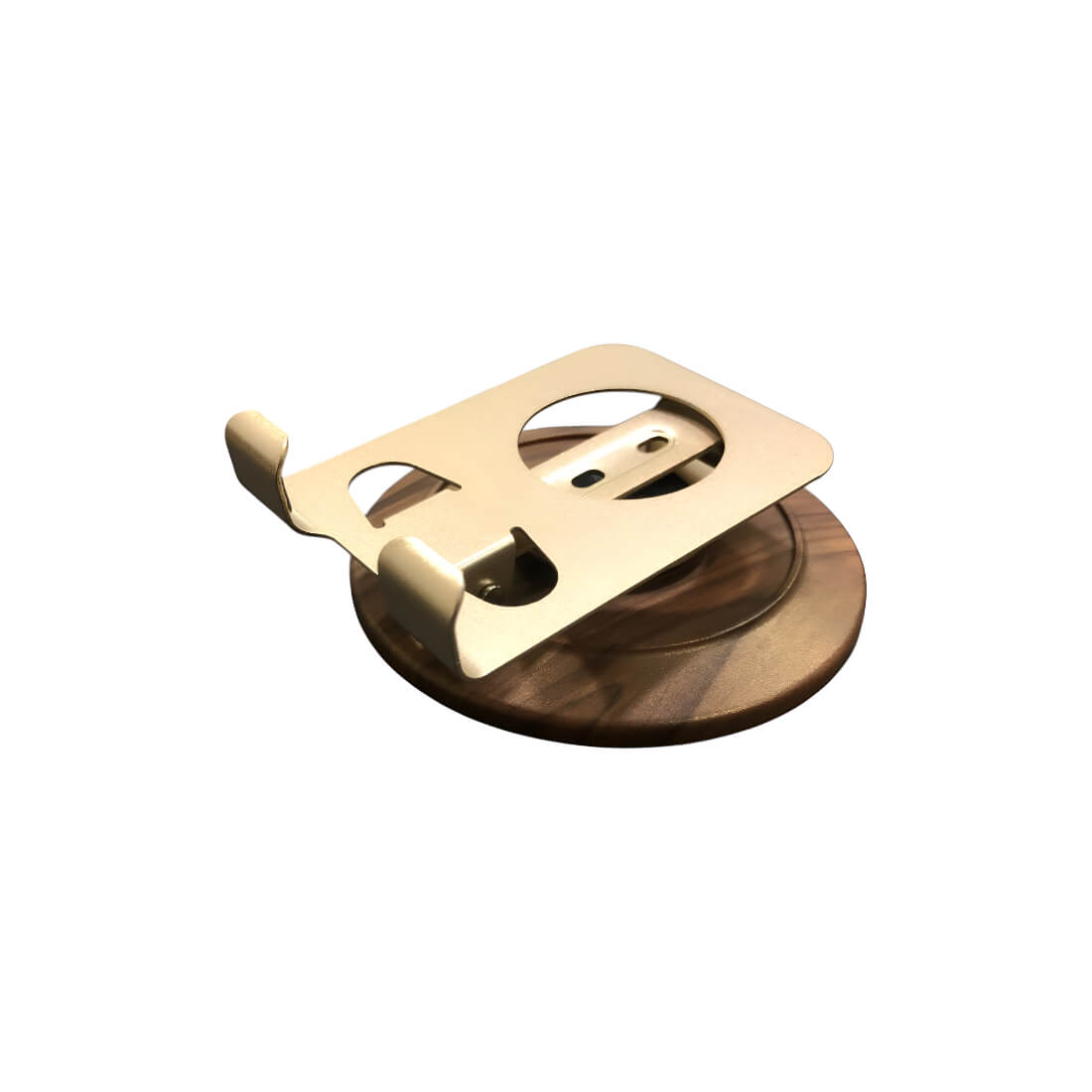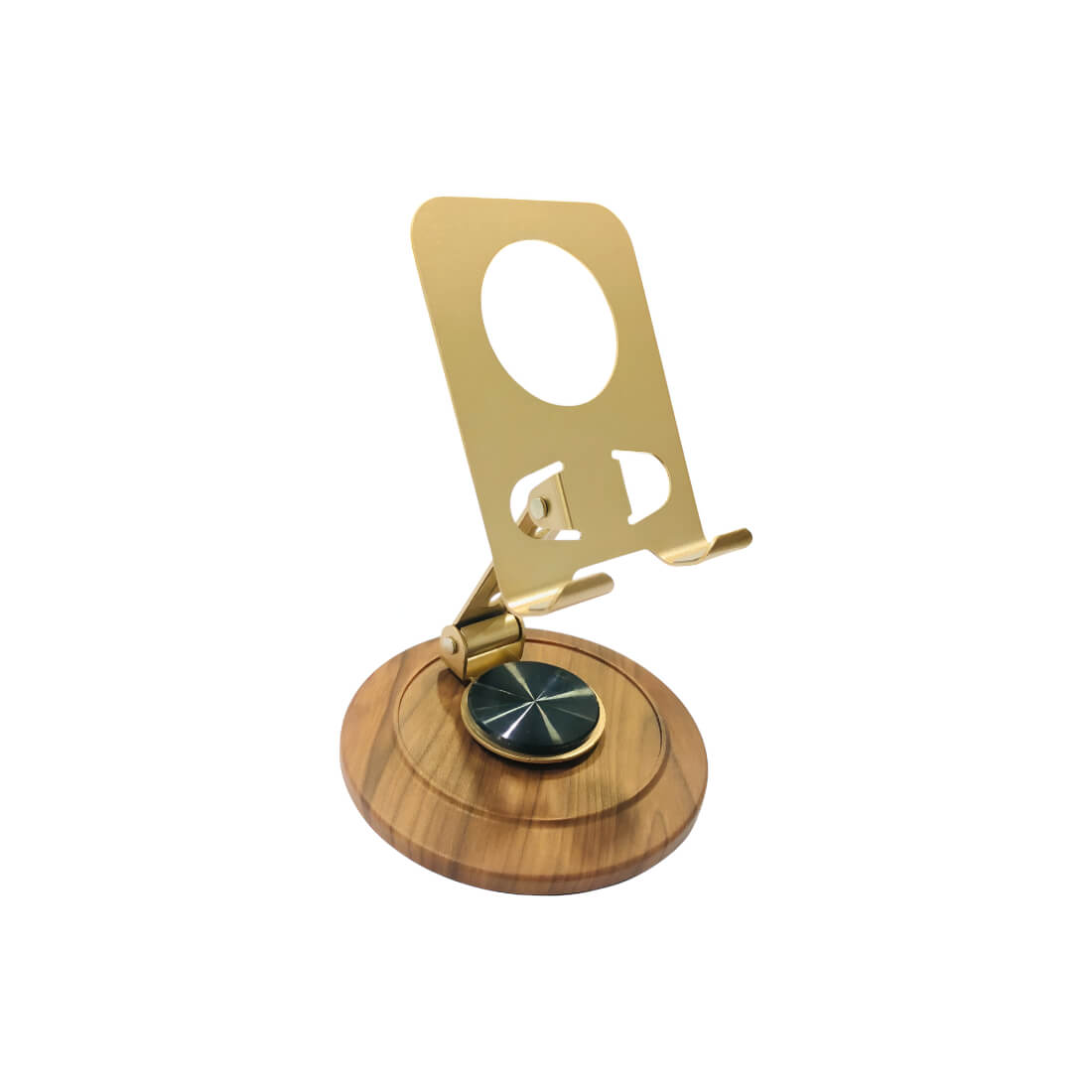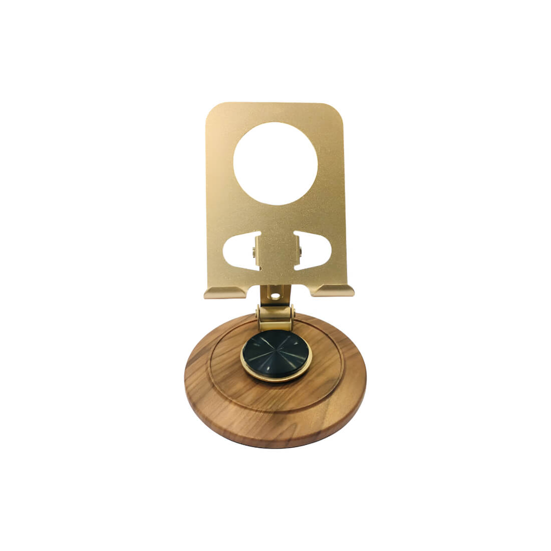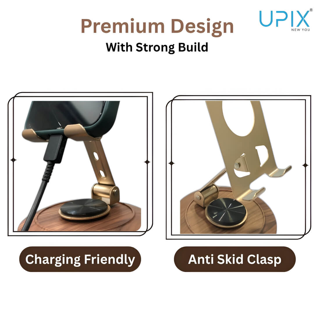 Upix Gold Plated Rotable, Foldable, Tabletop Mobile Stand, Designed to support most smartphones in both portrait and landscape modes, this holder is perfect for video calls, watching movies, reading, or hands-free browsing. The adjustable hinge mechanism allows you to tilt your phone to the perfect angle for comfort and convenience Stable & Anti-Slip Base – Heavy wooden base provides solid stability, keeping your phone steady on any surface – desk, table, or nightstand.